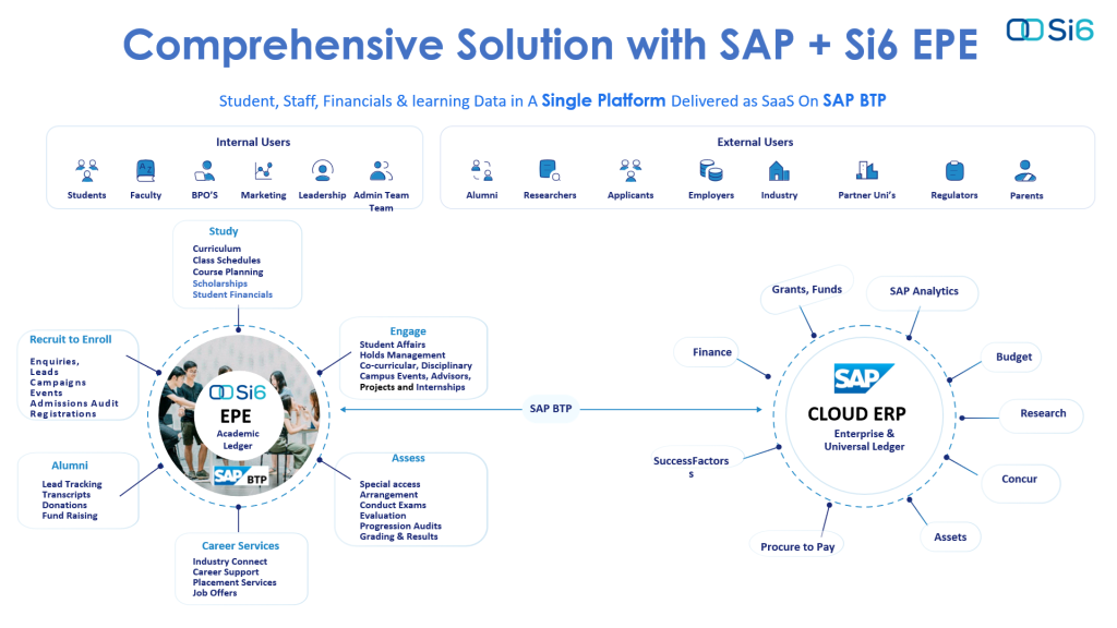 A future-ready education cloud powered by SAP BTP streamlining academic operations and student journeys from admission to success and lifelong alumni engagement.
